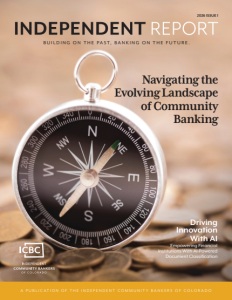 ©2026 The Independent Community Bankers of Colorado (ICBC) | Memberlink Solutions DBA The newsLINK Group LLC. All rights reserved. Independent Report is published six times per year by The newsLINK Group LLC for ICBC and is the official publication for this association. The information contained in this publication is intended to provide general information for review, consideration and education. The contents do not constitute legal advice and should not be relied on as such. If you need legal advice or assistance, it is strongly recommended that you contact an attorney as to your circumstances. The statements and opinions expressed in this publication are those of the individual authors and do not necessarily represent the views of ICBC, its board of directors or the publisher. Likewise, the appearance of advertisements within this publication does not constitute an endorsement or recommendation of any product or service advertised. Independent Report is a collective work, and as such, some articles are submitted by authors who are independent of ICBC. While a first-print policy is encouraged, in cases where this is not possible, every effort has been made to comply with any known reprint guidelines or restrictions. Content may not be reproduced or reprinted without prior written permission. For further information, please contact the publisher at (855) 747-4003. 6732 W. Coal Mine Ave., #640 • Littleton, CO 80123 • (303) 832-2000 2025-2026 OFFICERS ICBC CHAIRMAN Mike Hurst President Del Norte Bank ICBC PRESIDENT Joe Martinez President & CLO San Luis Valley Federal Bank ICBC PRESIDENT-ELECT Robert Holt Senior Credit Officer & SVP North Valley Bank ICBC ICBA STATE DIRECTOR PJ Wharton President & CEO Yampa Valley Bank ICBC STAFF EXECUTIVE DIRECTOR Mike Van Norstrand mvannorstrand@icbcolo.org ADMINISTRATION DIRECTOR/ TREASURER Maelynn Lewis mlewis@icbcolo.org ADMINISTRATIVE SUPPORT MANAGER Lori Arellano larellano@icbcolo.org LEGAL COUNSEL Christian Otteson Partner Otteson Shapiro LLP LOBBYIST Mary Marchun Founding Partner The Capstone Group 2025-2026 DISTRICT DIRECTORS DISTRICT A Kent Jones, President & CEO, Flatirons Bank Jamie Santistevan, COO, Native American Bank Mark Sheeley, President & CEO, RNB State Bank/Front Range State Bank Jeff Walker, Senior Vice President & CCO, Redstone Bank DISTRICT B Mark Brase, President, Points West Community Bank Tim Croissant, Market President, Bank of Colorado Travis Goeglein, Senior Vice President, First FarmBank Scott Applegate, President & CEO, Bank of Estes Park DISTRICT C Ben Johnson, President, First National Bank Colorado Miles McClure, CEO, Rocky Mountain Bank & Trust Peter Page, Executive Vice President & COO, Frontier Bank Kathryn Perry, Senior Vice President, Park State Bank & Trust DISTRICT D Dan Ebert, Vice President, Evergreen National Bank John Stelzriede, Market President — Colorado River Region, Alpine Bank Niki Stotler, President & CEO, High Country Bank Chad Zummach, Executive Vice President, Gunnison Bank & Trust ICBC ADVISORY BOARD MEMBERS Eric Budreau Partner Eide Bailly Jim Hall Managing Director Bond & Specialty Insurance — Financial Institutions, Travelers Bill Mitchell CEO Bankers’ Bank of the West Christian Otteson Partner Otteson Shapiro LLP 2 | INDEPENDENT REPORT