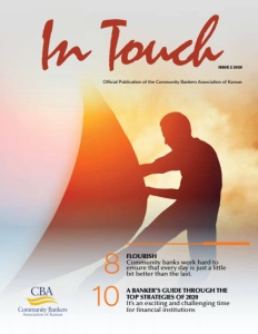 In Touch Official Publication of the Community Bankers Association of Kansas ISSUE 2 2020 10 FLOURISH Community banks work hard to ensure that every day is just a little bit better than the last. A BANKER’S GUIDE THROUGH THE TOP STRATEGIES OF 2020 It’s an exciting and challenging time for financial institutions 8