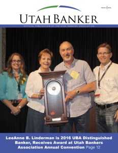 ISSUE 2 2016 O F F I C I A L P U B L I C A T I O N O F T H E U T A H B A N K E R S A S S O C I A T I O N LeeAnne B. Linderman is 2016 UBA Distinguished Banker, Receives Award at Utah Bankers Association Annual Convention Page 12