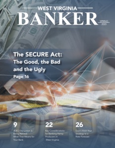 BANKER WEST VIRGINIA SPRING 2020 3DES Encryption Is Being Retired: What That Means for Your Bank Don’t Hitch Your Strategy to a Rate Forecast Key Considerations for Banking Hemp Producers in West Virginia 9 22 26 Page 16 The SECURE Act: The Good, the Bad and the Ugly
